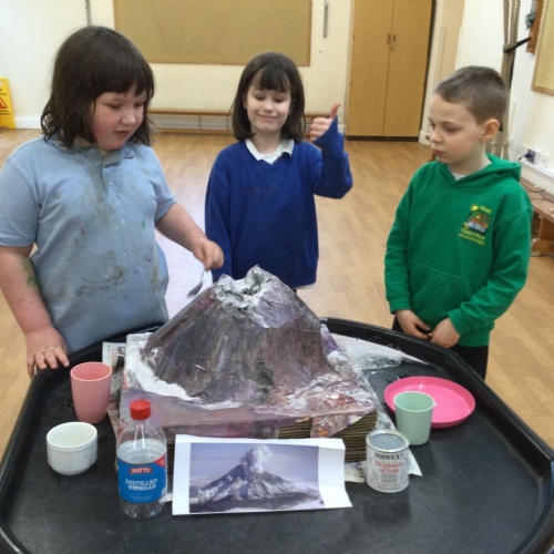 A group of children successfully built and erupted a papier-mâché volcano this week. After constructing the model, the students painted it before preparing the final experiment.